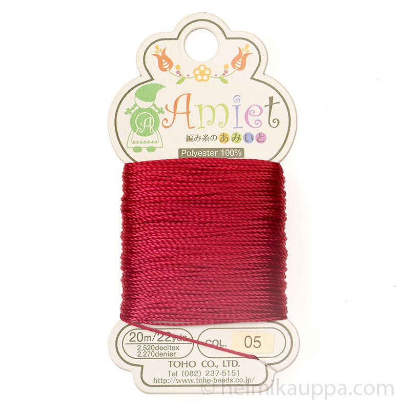 Monikäyttöinen Toho Amiet -lanka sopii moniin koruihin. Tukevaa lankaa voidaan pujottaa myös ilman neulaa. Langan paksuus on 0,6 mm, ja se sopii myös makramee-koruihin sekä kumihimoon. Materiaali: 100% polyesteri Paksuus: 2520 decitex. Made in Japan.